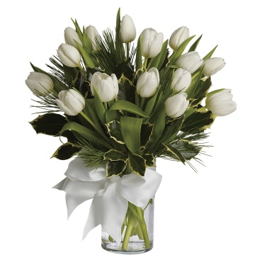 For a wintertime bouquet that's as pure as the driven snow, send this unexpected gift of ten white tulips, accented with aromatic white pine, and adorned with a silver ribbon. A simple pleasure for a peaceful season.